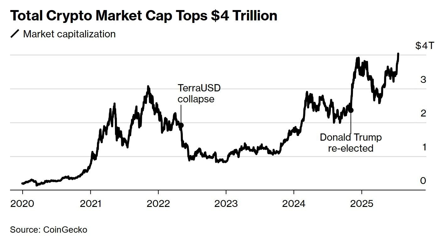 The total market capitalisation of cryptoassets rose past $4 trillion for the first time this week.
